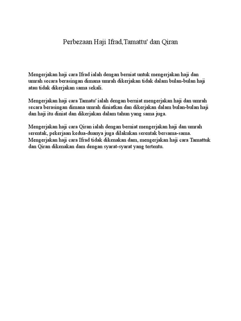 Jenis Haji Dan Keutamaan Haji Tamattu Ifrad Qiran. Haji ifrad adalah melaksanakan haji saja. Cara mengerjakan ibadat haji.